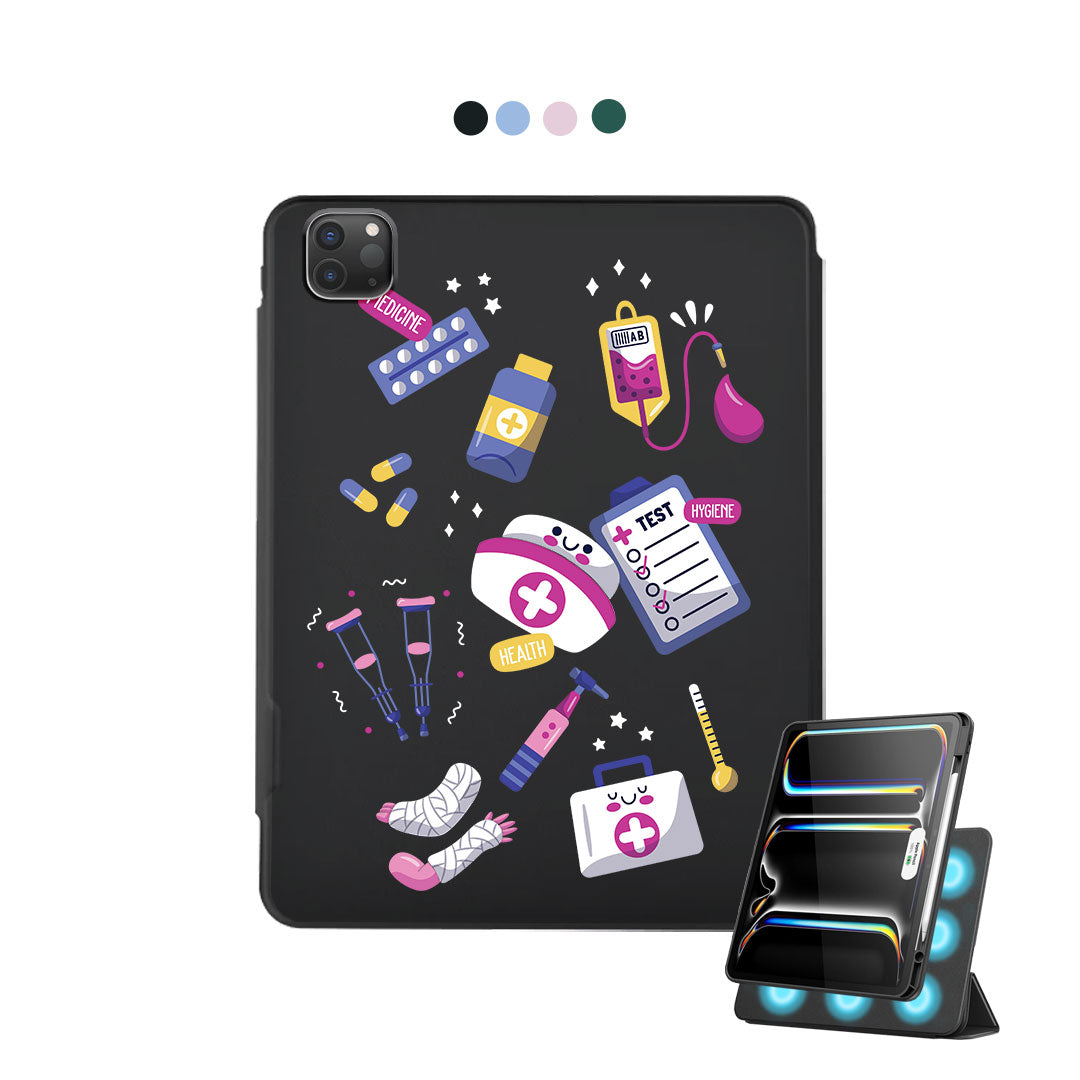 Material - Acrylic backshell with TPU armour on each side for extra protection. Flipcover made of Polyurethene with velvet lining on the inside. Plus, Apple Pen slot ready!